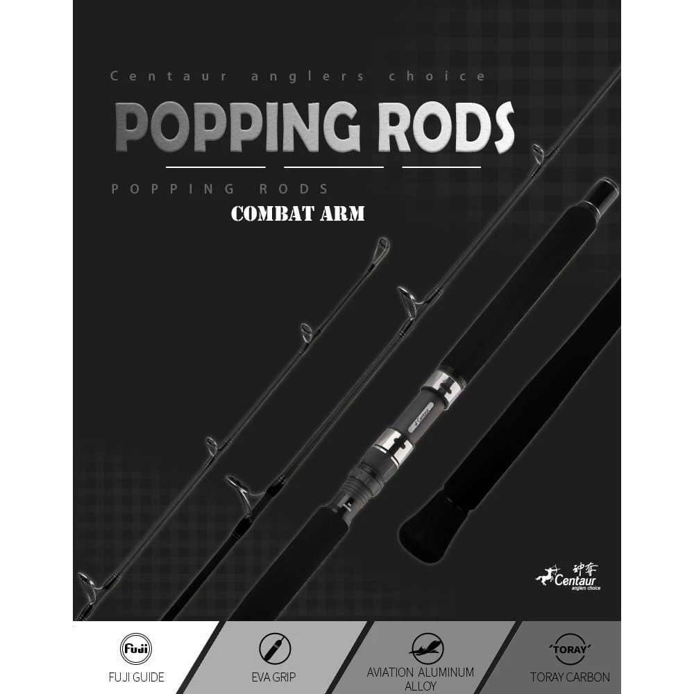 Built to cover Pelagics like Tuna and GT’s, the Centaur Combat Arm “Big One” Popping Rods utilize premium components that take upon the needs and demands of anglers. Lightweight, balanced and powerful, the 80MNSML matches perfectly to 10000 & 14000 sized reels, perfect for a medium duty popping stick to battle bluefins and yellowfins in the Northeast. Toray Carbon blank construction, EVA foam grips, Fuji Corrosion Control guides with alconite rings, and Fuji reel seat make this rod a refined option. This rod utilizes a two piece hidden butt joint system, popular amongst many popping rods due to its one piece feel with minimal weight increase. Great for travel overseas as well.