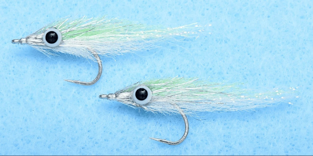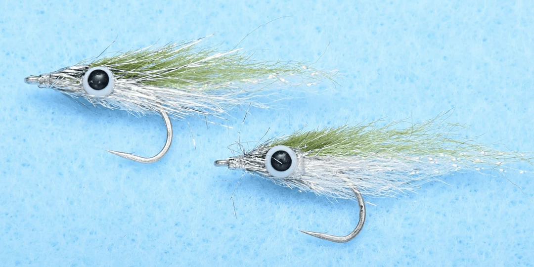The smallest of the EP baitfish flies. Complete with eyes and a solid #2 Gamakatsu saltwater hook.