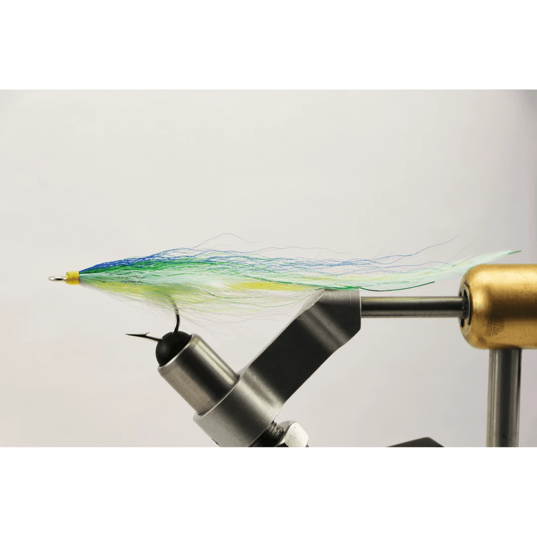 Halfway between a Rhody Flat Wing and Ray’s Fly, ths blue, yellow and green bucktail fly will crush bass all season long!