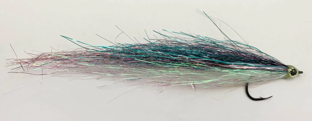 Skok’s Super Mushy is a bluewater fly that presents a ton of flash to engage pelagic predators’ eyes and consists of a durable super hair core supported by epoxy to preserve the baitfish profile. For its size the Super Mushy casts remarkable well, the flash and hair sheds water nicely. It works incredibly well for striped bass in New England.