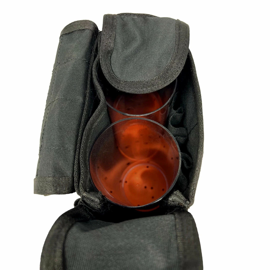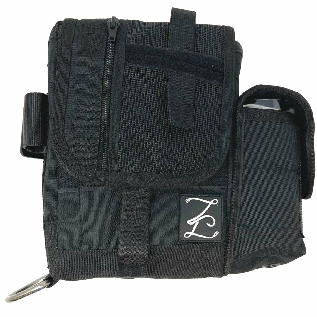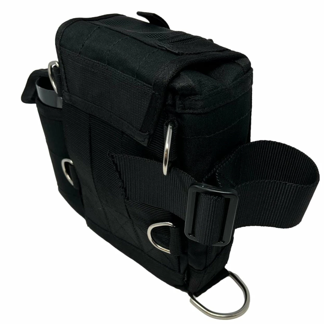 On the right side of the bag, a additional storage pouch allows for a shorter third tube and convert this bag into a three tube bag. It also fits other accessories and tools like a water bottle, buck tail trailers and more. On the left side of the bag, a short 2″ wide utility strap accommodates a variety of tools and gear. Small belt accessories like knives, pork rind holsters, plier sheaths and others fit well on the utility strap, while boga grips and other gripping tools fit when attached to the large D-ring and secured snuggly on the utility strap.